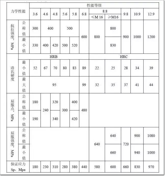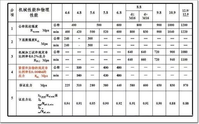 螺栓按照性能等級分3.6、4.6、4.8、5.6、5.8、6.8、8.8、9.8、10.9、12.9共十個等級,其中8.8級以上螺栓材質為低碳合金鋼或中碳鋼并經過熱處理(淬火、回火),通稱為高強度螺栓,8.8級以下(不含8.8級,精制普通螺栓也包含8.8級)通稱為普通螺栓。下表為螺栓的性能等級及力學性能(詞條“力學性能”由行業大百科提供)。