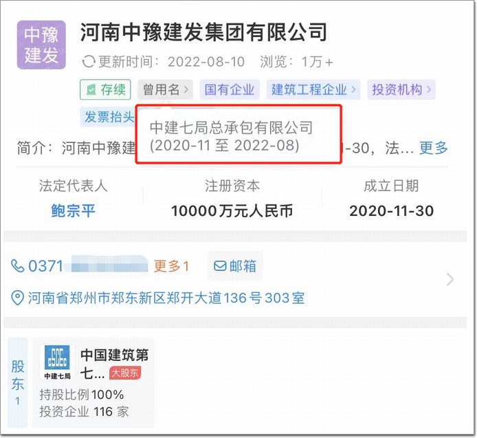 2022年8月9日,據工商信息顯示,中建七局總承包有限公司變更企業名稱:河南中豫建發集團有限公司。