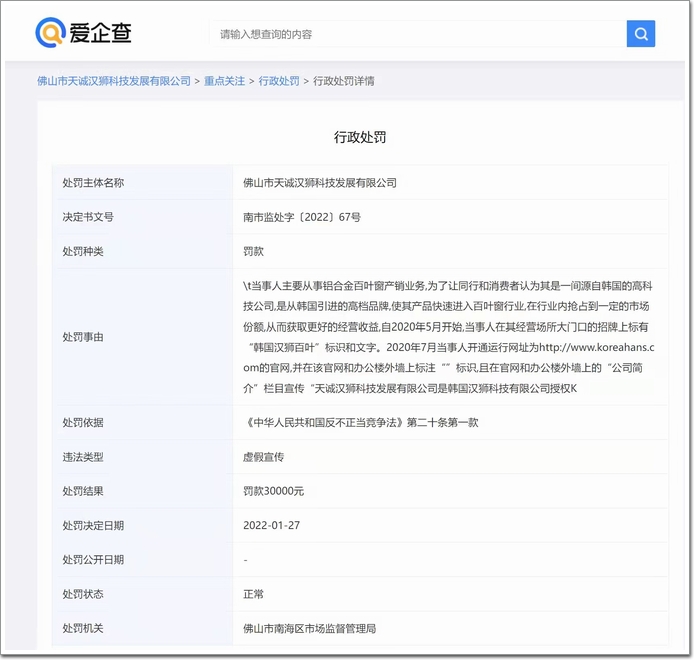 據信用中國(廣東佛山)和愛企查在2022年4月份公示了“天誠漢獅”山寨正品漢獅介紹虛假宣傳的違法事實,佛山市南海區市場監督管理局對其處以3萬元罰款。