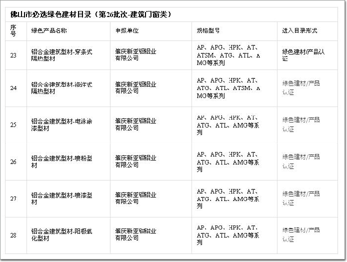 喜訊:新亞鋁公司六大系列產(chǎn)品獲準進入佛山市必選綠色建材目錄!