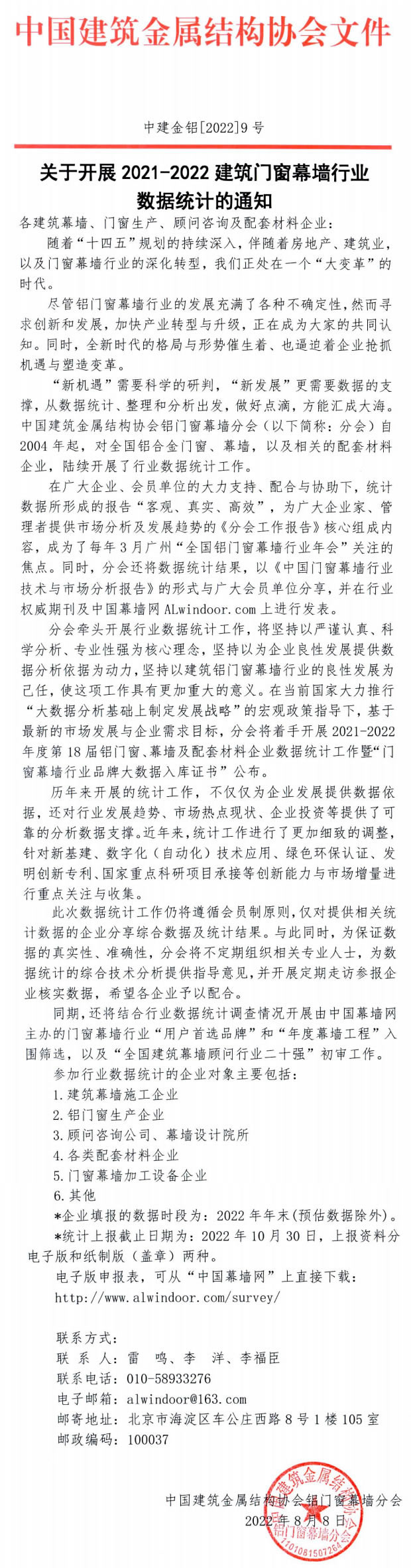 關于開展2021-2022建筑門窗幕墻行業(yè)數(shù)據(jù)統(tǒng)計的通知