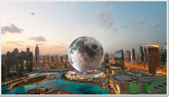 球形建筑外部復刻月球表面,遠望猶如月球漂浮于城市之上。據開發商介紹,這是一個“實時真實環境”,沒有增強或虛擬現實,一切讓你相信你就在月球上。