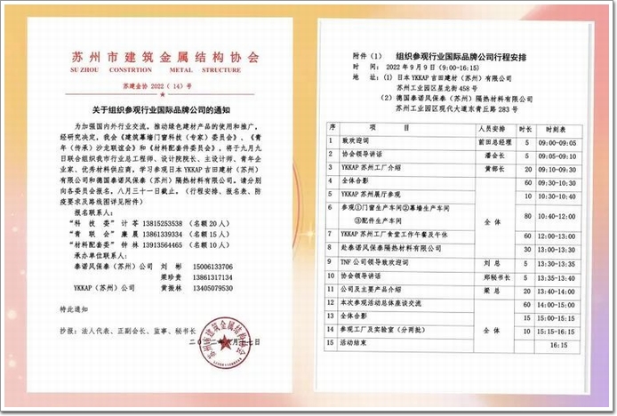 為更深入推動綠色美好城市建設,加強國內外行業交流,促進綠色建材產品的使用和推廣, 根據蘇州市建筑金屬結構協會【蘇建金2022(14)號文】的要求,由協會《建筑幕墻門窗科技(專家)委員會》、《青 年(傳承)沙龍聯誼會》和《材料配套件委員會》聯合組織,我市各企業總工程師、設計院院長、主設計師、青年企 業家、優秀材料供應商,學習參觀協會副會長單位、國際品牌企業:日本 YKKAP 吉田建材(蘇州) 有限公司和德國泰諾風保泰(蘇州)隔熱材料有限公司。通知發出限額報名不到兩天,名額爆滿。可見大家的學習熱情有多高。