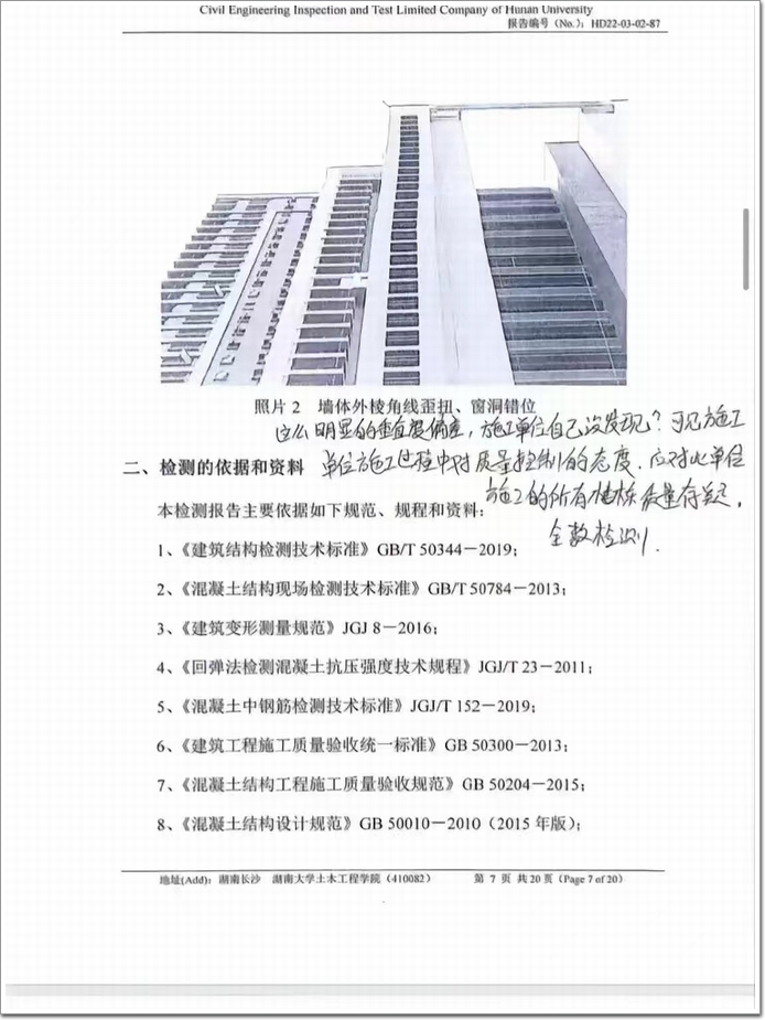 該小區(qū)原計(jì)劃定于9月交付,目前外立面已經(jīng)完成,整體處于收尾驗(yàn)收階段。小區(qū)業(yè)主注意到該小區(qū)7號(hào)棟外墻棱角歪斜肉眼可見(jiàn),要求開(kāi)發(fā)商委托檢測(cè)機(jī)構(gòu)進(jìn)行結(jié)構(gòu)安全檢測(cè)。