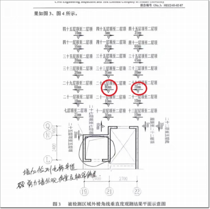 該棟樓外立面偏差最大處80mm,規(guī)范GB50204-2015要求結(jié)構(gòu)垂直度為1/1000并且不大于30mm,超出規(guī)范較多。檢測(cè)報(bào)告結(jié)論有些保守,視乎并未直接說(shuō)明外墻垂直度偏差是否會(huì)影響該棟建筑結(jié)構(gòu)安全,是否會(huì)影響墻體受力性能,只是給出了建議性的整改措施。