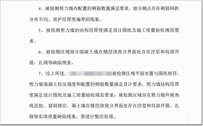 檢測(cè)報(bào)告建議處理方式是:要求對(duì)被檢測(cè)區(qū)域剪力墻垂直度存在偏差的部分采用高性能(高強(qiáng)度、高抗裂)水泥符合砂漿鋼筋(詞條“鋼筋”由行業(yè)大百科提供)網(wǎng)等方法修補(bǔ)至平整,以保證剪力墻有效截面滿足設(shè)計(jì)要求。