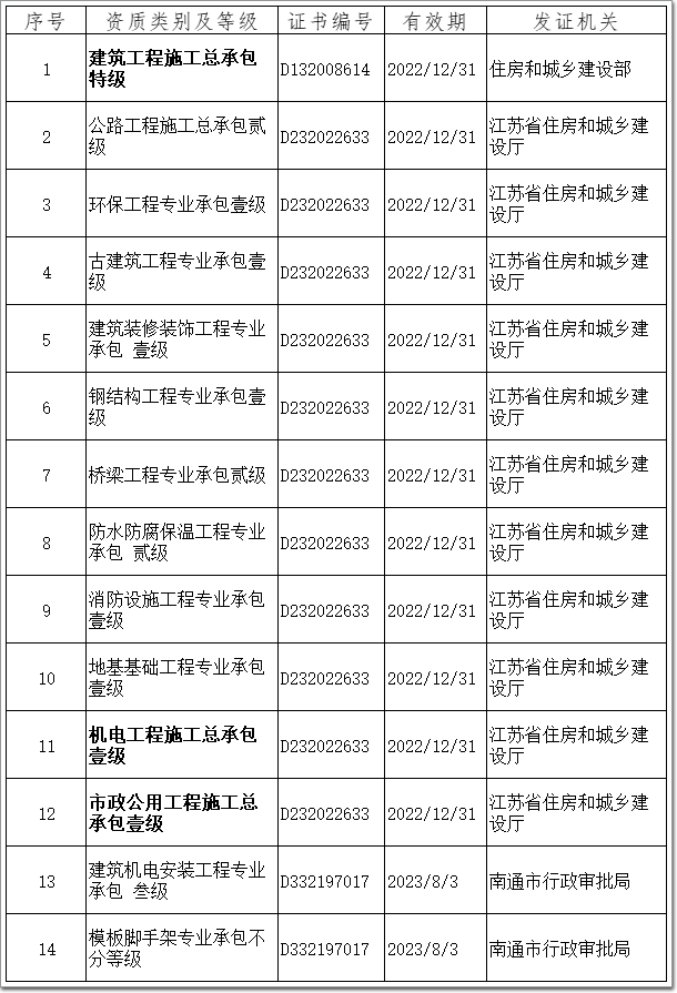 南通六建擁有包括建筑工程施工總承包特級資質(zhì)在內(nèi)的14項建筑業(yè)企業(yè)資質(zhì),主營建筑、裝飾、裝修和其他建筑業(yè),施工范圍涵蓋房建、機電、裝飾、市政、公路、園林、古建、環(huán)境等領域,市場遍及10多個國家及地區(qū)。