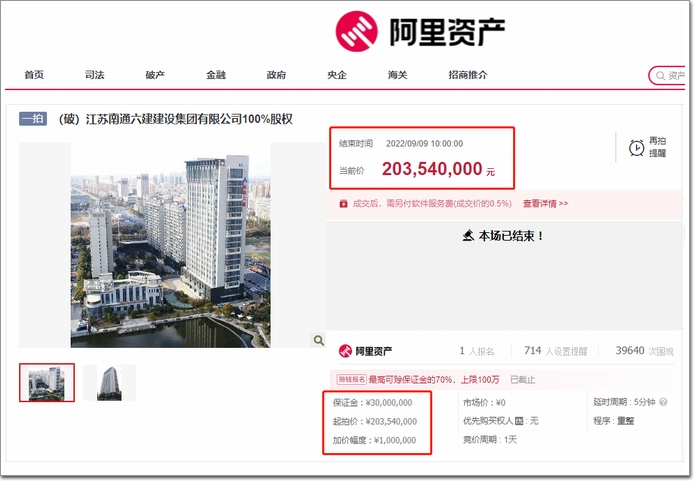 9月8日10時,江蘇南通六建建設集團有限公司100%股權(quán)將以2.0354億元起拍。