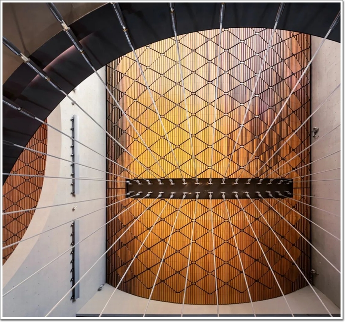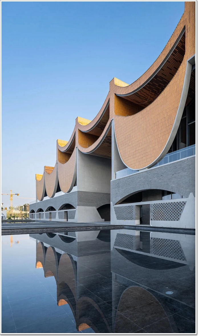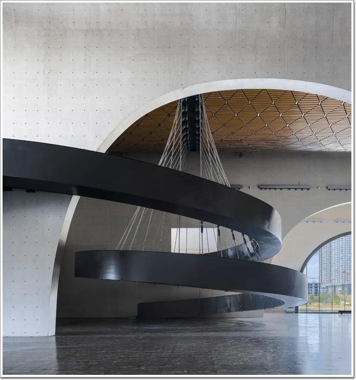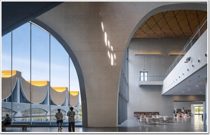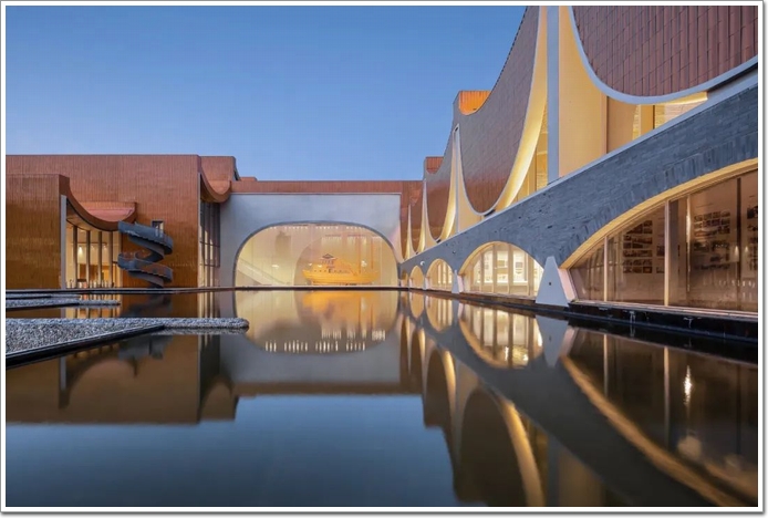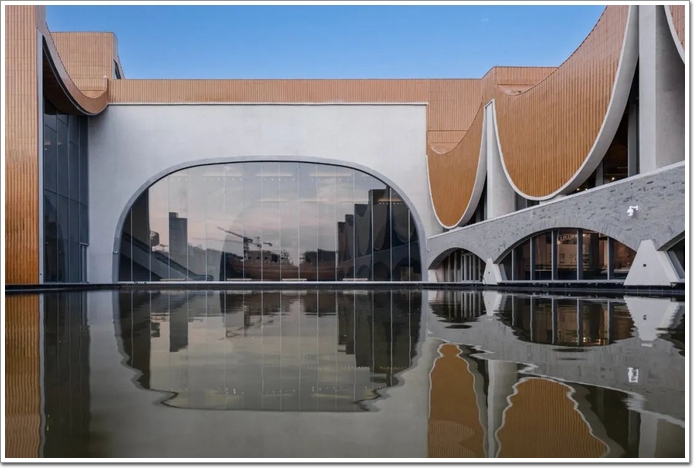 所以,設(shè)計(jì)團(tuán)隊(duì)抓住隋唐大運(yùn)河這一古代水利工程的技術(shù)特征,以洛河上架設(shè)的拱橋結(jié)構(gòu)為原型,配合顏色典雅的面板材料點(diǎn)綴,以及大尺寸的玻璃幕墻裝飾,以現(xiàn)代建造技術(shù)的自然呈現(xiàn),來(lái)取代對(duì)傳統(tǒng)風(fēng)格的具象模仿,從而實(shí)現(xiàn)古今文明的對(duì)話。
