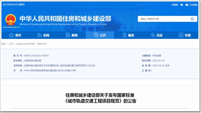 現批準《城市軌道交通工程項目規范》為國家標準,編號為GB 55033-2022,自2023年3月1日起實施。本規范為強制性工程建設規范,全部條文必須嚴格執行,F行工程建設標準中有關規定與本規范不一致的,以本規范的規定為準。同時廢止現行國家標準《城市軌道交通技術規范》GB 50490-2009和下列現行工程建設標準相關強制性條文: