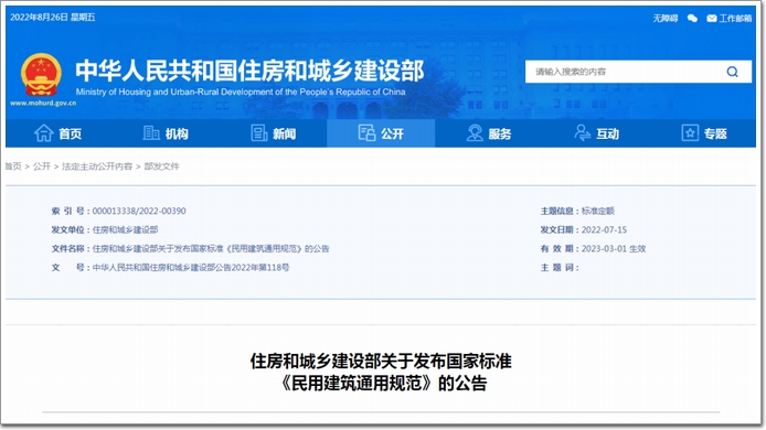 現批準《民用建筑通用規范》為國家標準,編號為GB 55031-2022,自2023年3月1日起實施。本規范為強制性工程建設規范,全部條文必須嚴格執行。現行工程建設標準中有關規定與本規范不一致的,以本規范的規定為準。同時廢止下列現行工程建設標準相關強制性條文: