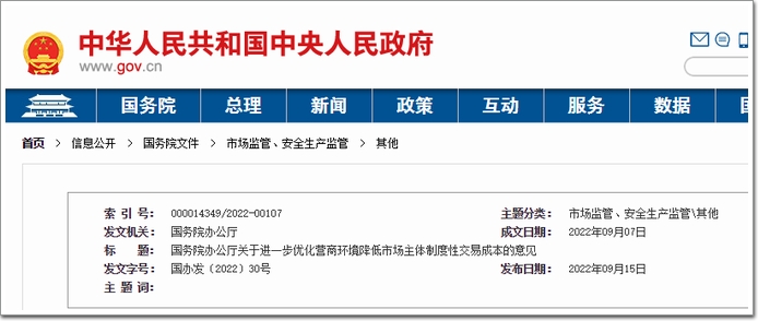 國(guó)務(wù)院辦公廳日前印發(fā)《關(guān)于進(jìn)一步優(yōu)化營(yíng)商環(huán)境降低市場(chǎng)主體制度性交易成本的意見》。