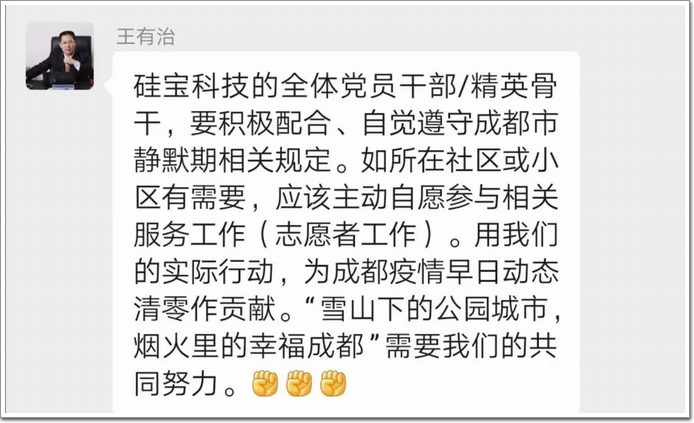 9月1日當天,公司董事長王有治迅速在公司微信群發出暖心提示,提醒硅寶員工要做到不信謠、不傳謠,提醒硅寶的黨員和干部要做出抗疫表率:
