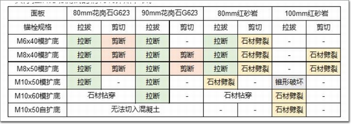 1.分別選用M6x40,M8x40、M8x50和M10x50、M10x60模擴底錨栓及M10x50自擴底錨栓在80mm、90mm花崗石和80mm、100mm砂巖上進行拉拔和剪切(詞條“剪切”由行業大百科提供)測試。