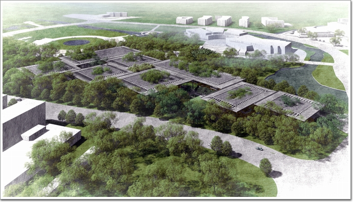 溫州是一個氣候溫和的城市,為了使建筑與環境密切融合,團隊化整為零,將內容豐富的交流中心布置成由八棟建筑組成的群體,分別為:大講堂、教室、圖書館、專家宿舍、學生中心、學生宿舍(兩棟)、及行政辦公。