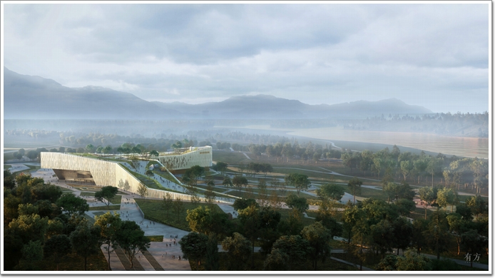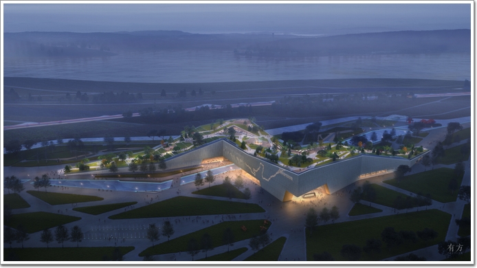 博物館建筑位處鄭州北部的黃河生態保護區內,將成為新規劃的黃河國家文化公園的亮點項目。呈現多邊形外觀造型的建筑主體如一方磐石,由堤岸山巒中孕育而出,與自然景觀渾然一體,蜿蜒體型使得建筑與公園中的曲流山水錯落相依,高低起伏。