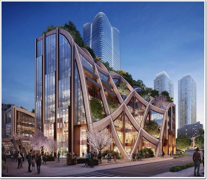 為將建筑體系與大量自然相結合,設計以“花園涼亭”為理念,并將其擴大到區域大小。這一概念使在創造空間的同時,為這個80000平方米的東京土地帶來一個更為整體的邏輯,住宅、商店、酒店、水療中心、學校和寺廟等設施都由網格框起來。