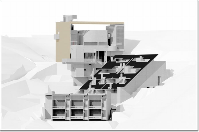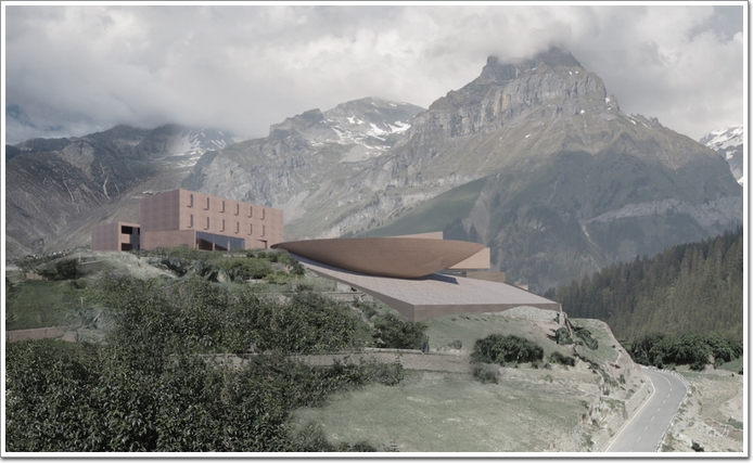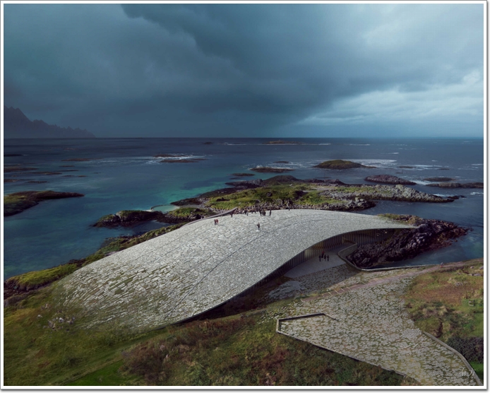 建筑從地面上緩緩升起,緩和的弧形屋面可供人散步。屋頂的形式由場地上的三個高點定義,地面空間則受到下方景觀的影響。屋頂覆蓋著天然石塊,隨著時間的推移,屋頂也會染上自然的痕跡。