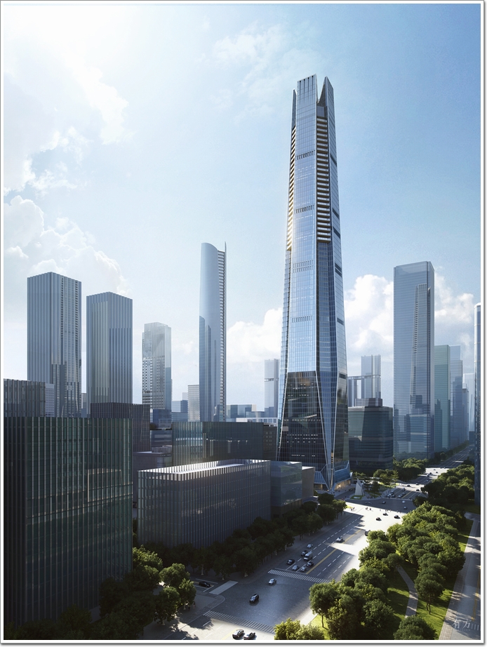 在建筑設計上,KPF結合塔樓從底部到頂部“精粹商業—商務辦公—云端會所—行政會館”各大功能對進深的不同要求,令塔樓體量由下向上逐漸縮小,在追求視覺穩定的同時雅致地向天空延伸,呈現出一座凌空展翼的超現代樓體。