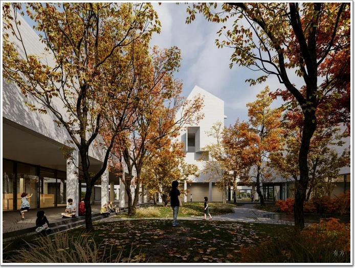 最終的校園規劃設計包括四棟以風車形式布局的不同建筑,形成了一個環形協作空間,并設置了從寬敞四方院子到私密休閑區等不同規模的室外空間。從歐式修道院到中國園林,這些內部庭院和外部立面的鮮明對比體現了跨文化校園景觀的基本概念。