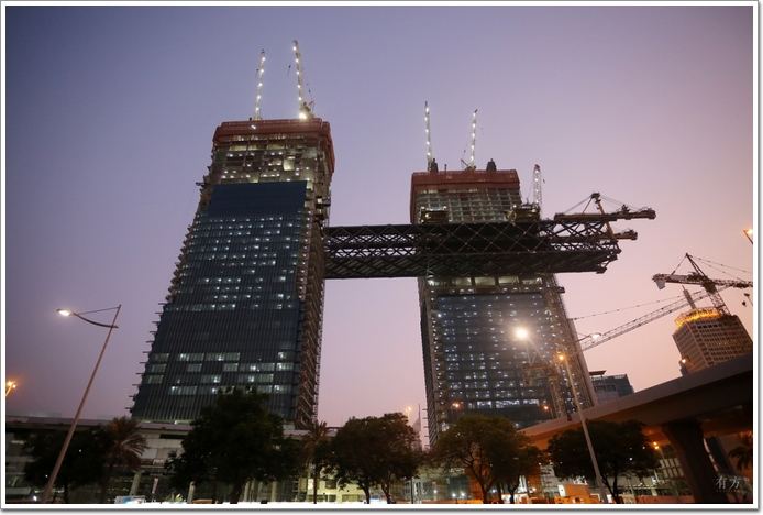 One Za'abeel位于迪拜國際機場通往市區的入口處,是由辦公、酒店、住宅和商業構成的綜合設施。在被高速公路隔斷的兩側地基上分別配置了兩棟超高層建筑,并通過距離地面約100米的鋼結構連廊“The Link”將其連接在一起,頂端是長約70米的懸臂。