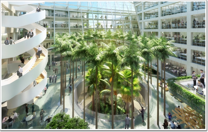 整個園區由一系列樹屋式的亭臺建筑組成,并通過一條中央步行“街道”將它們連接在一起。玻璃走廊將園區內的一座座建筑連成一個整體,而其中點綴著一系列或露天或室內的庭院。室內外景觀相交織,打造出一個與周邊公園融為一體的獨特辦公系統。