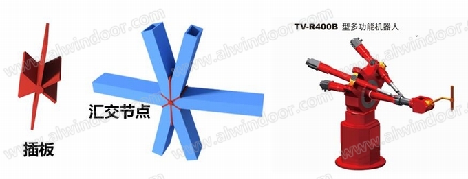 因為是三角形拼接網筒,每個交接節點為6個桿的拼接,為了保證加工及施工精度,桿件交接部位采用插板進行拼接。桿件采用5自由度多功能機器人進行桿件的端頭加工,采用火焰切割或等離子切割實現。5自由度混