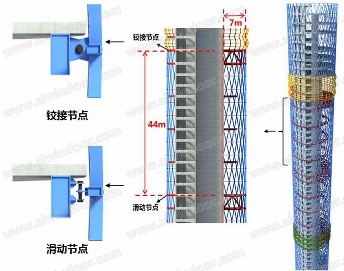 網殼高度方向生根點間距很大,最大高度44米,整個網架為吊掛柔性網殼體系。通過上部鉸接節點和下部滑動節點的特殊構造設計,保證了整個桶狀網殼結構的變形和受力。