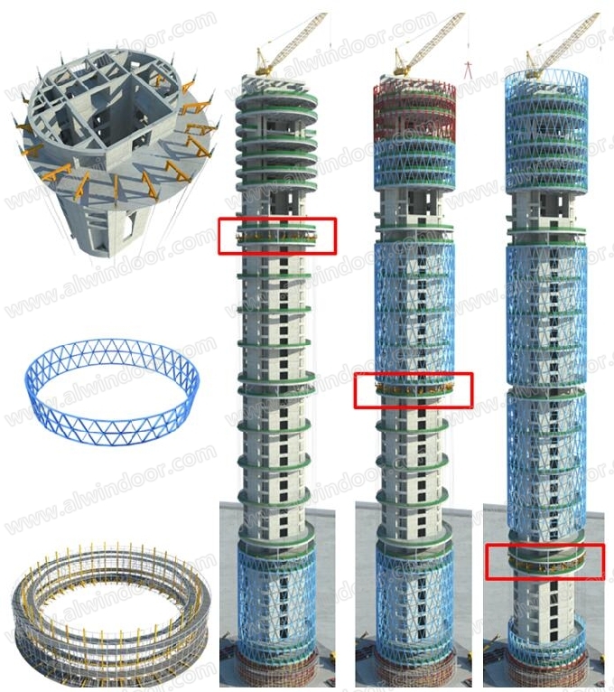 提升設備安裝于36m層,提升0-36m段幕墻鋼結構,提升鋼架高度36米。