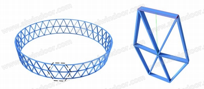 最終本項目采用了三角形單元板塊,每層72個三角形板塊——36個正三角板塊+36個倒三角板塊,底邊2310mm,高4000mm;