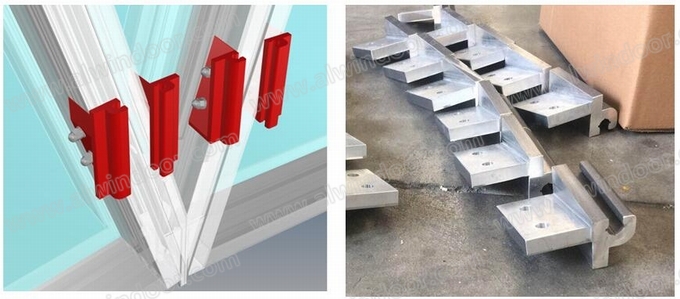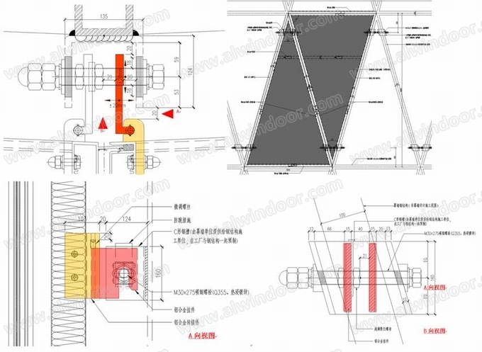 加工完成的型材在工廠進行組框,其中三角形兩個公立柱或者兩個母立柱組框的部位是本項目的難點,需借助鋁角碼進行組框。組框詳圖如下: