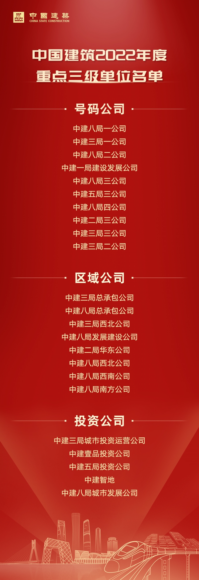 從榜單中看出,一共23家三級(jí)單位上榜(號(hào)碼公司10家+區(qū)域公司8家+投資公司5家),中建八局和中建三局共有17家單位上榜(八局10家+三局7家),可謂是占領(lǐng)了大半壁江山!