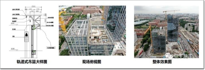 環形軌道的布置位置根據樓層或屋頂不同搭設位置分別選擇,針對超高層結構為了保證現場進度一般至少分上下兩個施工段,軌道上部搭設安全防護棚。