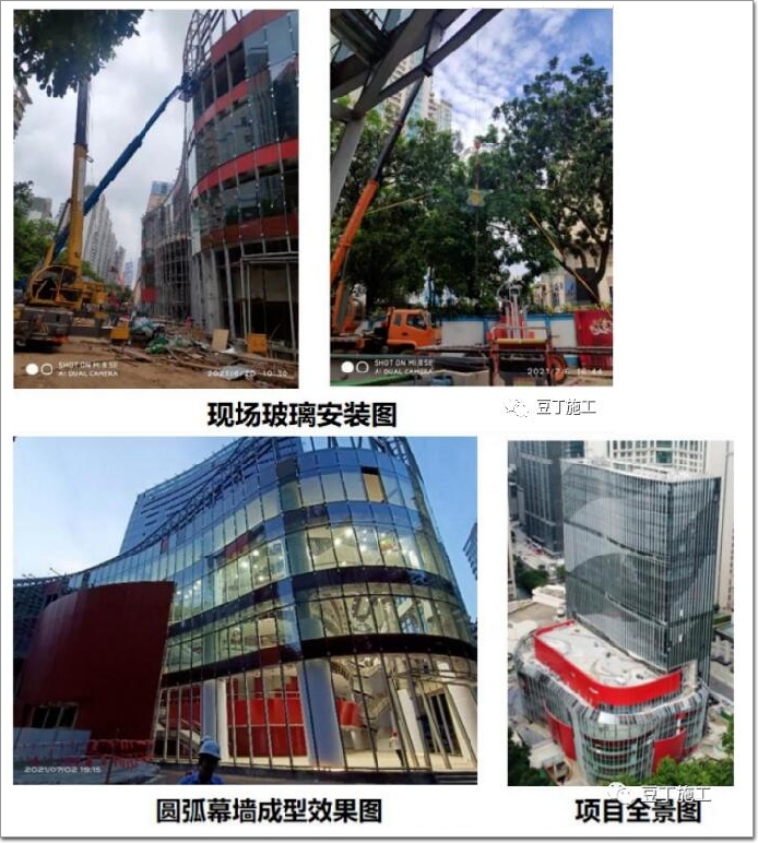 粵劇院項目裙樓(詞條“裙樓”由行業大百科提供)采用倒梯形圓弧幕墻。項目玻璃單片面積4~6m²,重量為240~360kg,規格尺寸復雜,安裝難度大現場安裝采用高空曲臂車及吊車配合安裝。由于場地狹小,高空曲臂車及吊車挪位困難,使得安裝進度雪上加霜。而且圓弧位置玻璃為圓弧狀,此類異型玻璃需等龍骨安裝完成后現場實地測量下單,弧形玻璃轉運困難易碎裂。