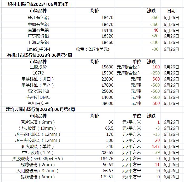 此原材料價格由中國幕墻網收集整理,僅供參考!