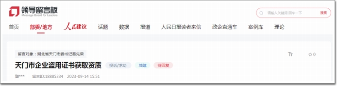 領導您好,華*混凝土(天門)有限公司在2022年5月開始到2023年4月,盜用本人信息職稱證書,違規獲取資質,參與資質維護,招投標(詞條“投標”由行業大百科提供)行為,本人從未在該公司任職過,也并不是該公司員工,在未經過我本人允許的情況下私自使用本人相關信息,希望相關部門查處并吊銷維護的相關人員資質,沒收招投標違規所得。