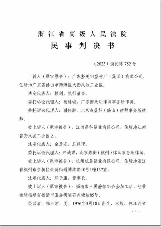近日,浙江省高級人民法院對《廣東堅美鋁型材廠(集團)有限公司訴江西晶科鋁業有限公司等侵害商標權及不正當競爭糾紛案》作出終審判決,判令被告立即停止商標侵權及不正當競爭行為,并賠償原告經濟損失及合理維權開支516萬元。