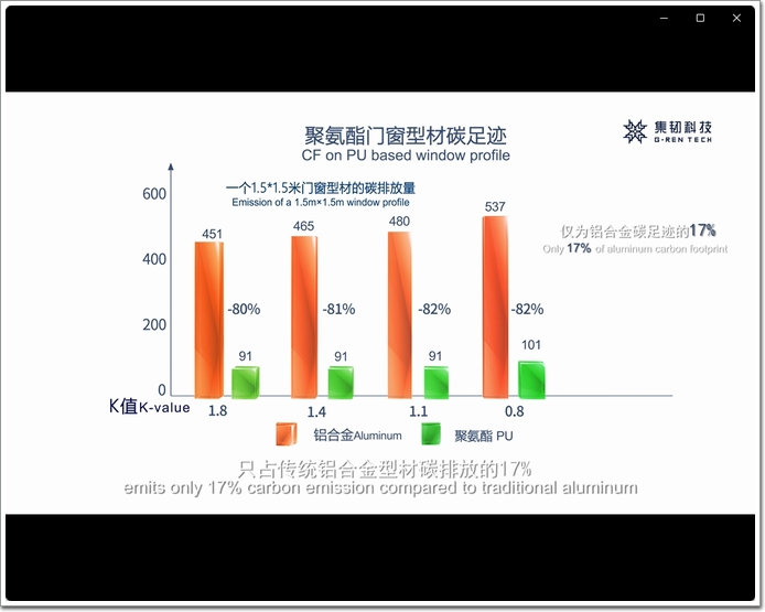 ●低碳排放:經(jīng)同濟大學調(diào)研結果顯示,集韌玻纖增強聚氨酯型材的碳排放量每噸僅為3014.78 kgCO2e,為傳統(tǒng)鋁合金型材的17%,這意味著使用這種材料可以大幅減少建筑物在建設及其運營過程中的碳排放量。