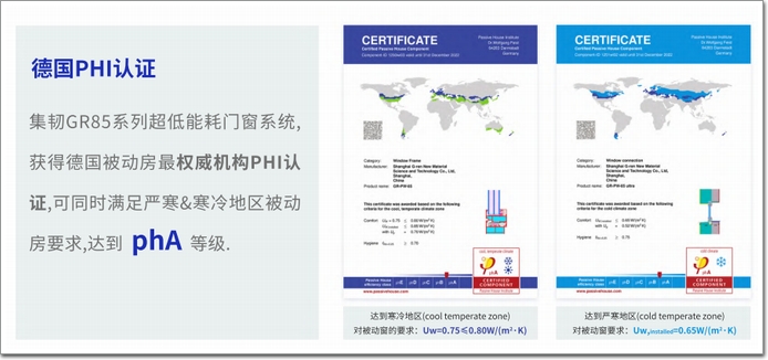 以集韌科技85系列超低能耗窗為例,經(jīng)韓國權威實驗室檢測,窗戶保溫性能K值可達0.654(W/m2·K),真正實現(xiàn)門窗型材“全斷橋”,并獲得德國被動房機構PHI認證,可同時滿足PHI對于嚴寒地區(qū)和寒冷地區(qū)的門窗保溫要求,達到phA等級,可大大降低建筑能耗。同時,比傳統(tǒng)被動房門窗更美觀,安裝更為便捷。