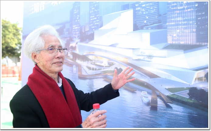 “三館合一”項目是由中國工程院院士何鏡堂領銜的華工團隊操刀設計,由美術館、非物質文化遺產展示中心、文學館組成,建筑東西向長度為350米,建筑高度呈30米至80米疊級而上,外型獨樹一幟,似珠江邊上一艘乘
