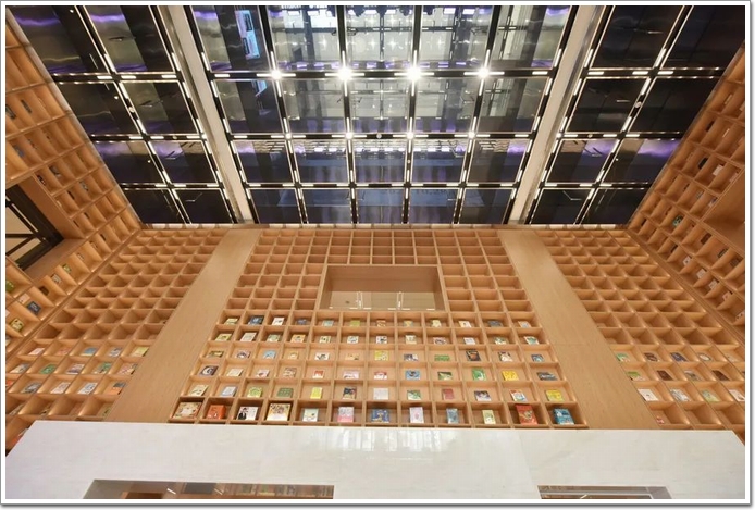 上海書城改造涉及1層至7層裙房,外立面被設計成許多冊書堆積成一個巨大城市的形象,迎合了“以書為城”的設計理念。建設方上海建工五建集團該項目負責人介紹,上海書城在改造設計之初,就被定位于上海第一個“碳中和鉑金級文化地標改造項目”,從前期策劃、施工、選材都融入低碳理念,如建筑總體綠色建材比例就高達78.57%。
