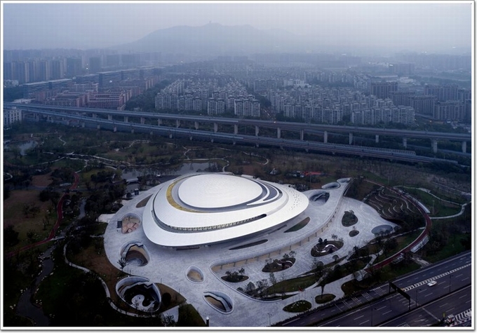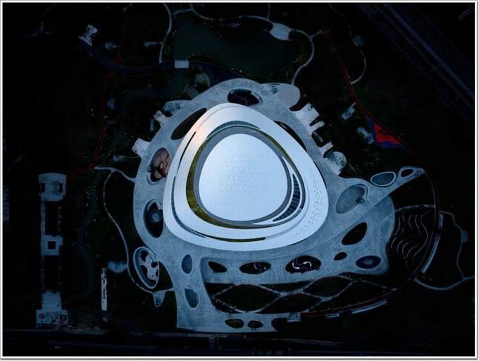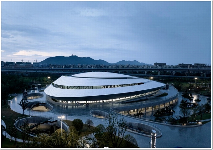 中國杭州電競中心場館以“星際漩渦”為設計理念,從空中俯瞰,形似一艘“星際戰艦”盤踞在北景園生態公園內,充滿科技感、未來感。