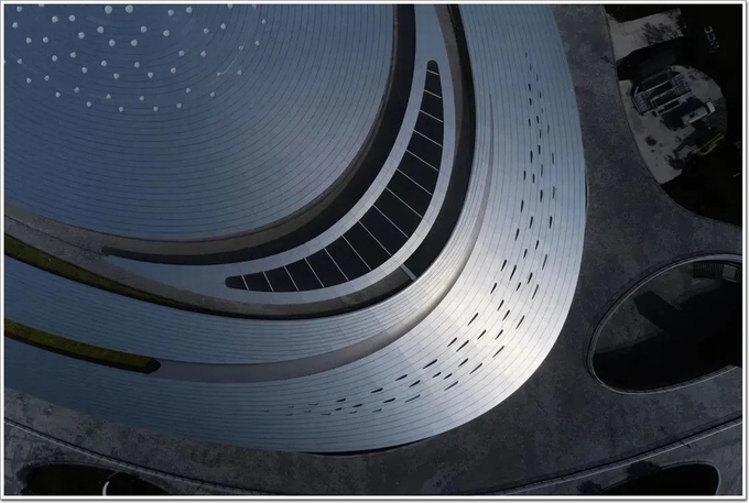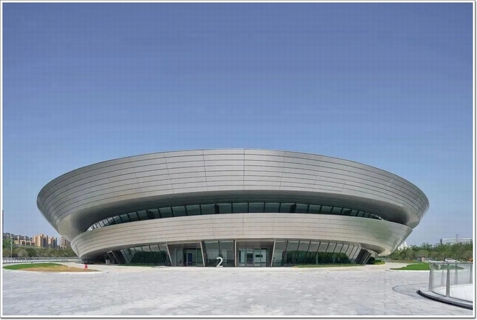 動感流暢的銀色建筑,猶如時空穿梭中的“星際戰艦”,連接幻想與現實,融合建筑與環境。該場館極具未來感、科技感的外立面幕墻鋁板,是由德國進口的諾貝麗斯(Novelis)陽極氧化原版,經國內的薩克森工業(嘉興)有限公司生產制造,復合而成。
