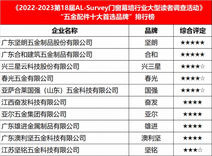 以上“TOP10”高端建筑五金品牌,由中國建筑金屬結構協會鋁門窗幕墻分會官方平臺——中國幕墻網ALwindoor.com根據“2022-2023年度AL-Survey五金十大首選品牌榜單”為基礎,開展科學化、合理的數據調研、整理分析之后公開發布。
