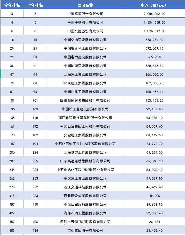 此外,中國建筑股份有限公司、中國鐵建股份有限公司、中國交通建設(shè)股份有限公司與去年排名持平,其中中國建筑連續(xù)十一年位列第三名。
