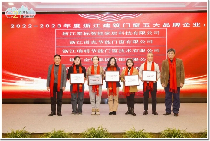 蘇州市建筑金屬結構協會總顧問兼總工程師潘元元先生、上海市建筑五金門窗行業協會秘書長錢經緯先生為“2022-2023浙江省建筑門窗五大品牌企業”頒發榮譽。