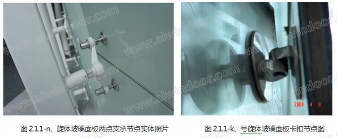 這種連接方式雖然能解決了玻璃板塊自重和水平荷載(詞條“水平荷載”由行業大百科提供)的傳遞,但同時又出現了板塊平面外不穩定的問題。為了能在不增加結構連接件(詞條“連接件”由行業大百科提供)的情況下,解決玻璃板塊平面外固定的問題,我們專門為該項目設計了玻璃面板卡扣式連接節點,也叫“雙層玻璃定位夾”。 (如圖2.1.1- h、i )