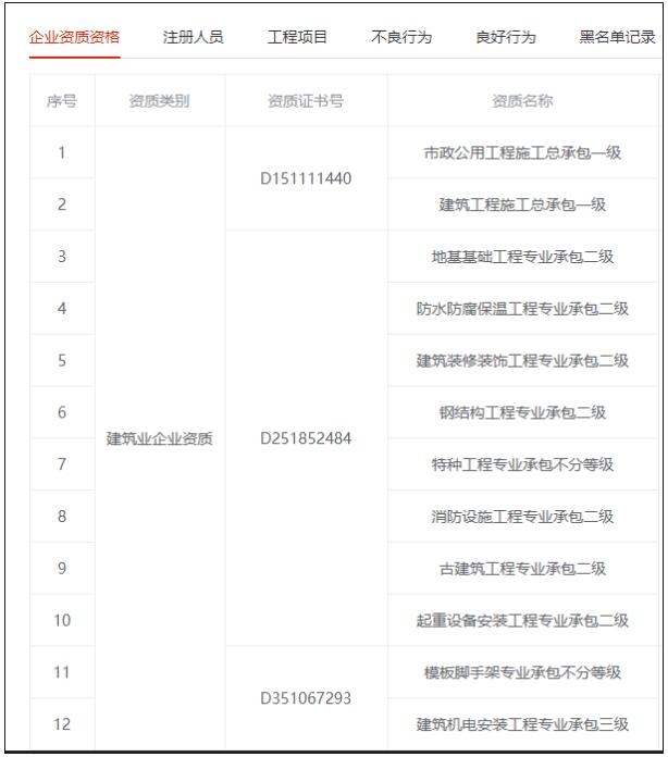 擁有市政公用工程施工總承包壹級資質,建筑工程施工總承包壹級、地基基礎工程專業承包貳級、防水防腐保溫工程專業承包貳級、建筑裝飾裝修工程專業承包貳級、鋼結構工程專業承包貳級、特種工程專業承包不分等級、消防設施工程專業承包貳級、古建筑工程專業承包貳級、起重設備安裝工程專業承包貳級、模板腳手架專業承包貳級、建筑機電安裝工程專業承包叁級等資質。