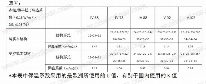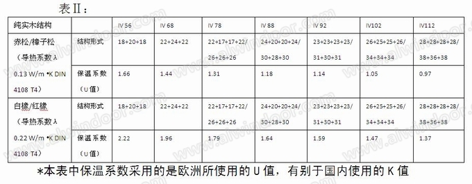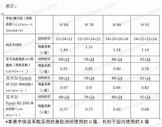 (IV 代表木型材厚度,IV68代表型材厚度為68毫米,以上表格的保溫系數為根據DIN4108 T4標準測試出的Uf值)