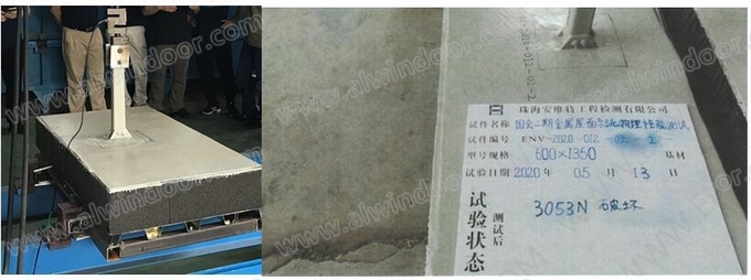 根據(jù)本項(xiàng)目屋面風(fēng)壓分布情況,計(jì)算出單個(gè)釘盤最大受力P為1.2kN, 為進(jìn)一步確保負(fù)風(fēng)壓下釘盤的抗拉拔承載力,在專業(yè)的實(shí)驗(yàn)室進(jìn)行了嚴(yán)格的抗風(fēng)揭實(shí)驗(yàn)及相關(guān)氣密、水密實(shí)驗(yàn),實(shí)驗(yàn)結(jié)果均滿足國家規(guī)范要求。其中釘盤拉拔實(shí)驗(yàn)如下所示: